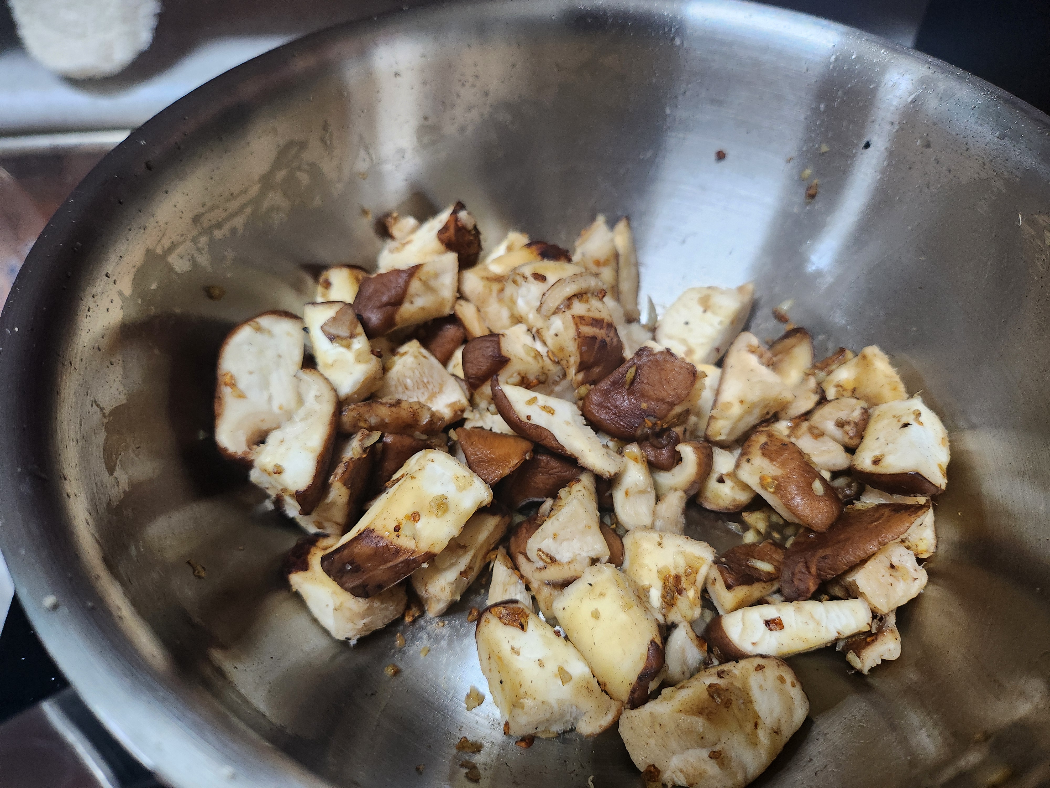 1. 팬에 올리브유를 두르고 마늘(1ts), 넣고 싶은 재료(스팸, 버섯 등)를 순서대로 볶기
